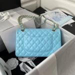 This medium classic double flap bag is crafted in light blue lambskin leather with light gold hardware, featuring the signature CC turnlock closure on the front flap, half-moon back pocket, adjustable interwoven light gold chain and light blue leather shoulder strap.