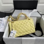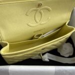 This medium classic double flap bag in yellow lambskin with gold hardware features the signature CC turnlock closure on the front flap, half-moon back pocket, adjustable gold interwoven chain and yellow leather shoulder strap.