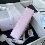 This medium classic double flap bag in light purple lambskin with light gold hardware features the signature CC turnlock closure on the front flap, half-moon back pocket, adjustable interwoven light gold chain and light purple leather shoulder strap.
