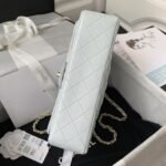 This medium classic double flap bag is made of light blue lambskin leather with light gold hardware, front flap with signature CC turnlock closure, half-moon back pocket, adjustable interwoven light gold chain and light blue leather shoulder strap.