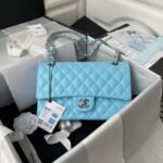 This medium classic double flap bag is crafted in light blue lambskin with silver hardware, front flap with signature CC turnlock closure, half-moon back pocket, adjustable light blue interwoven chain and light blue leather shoulder strap.