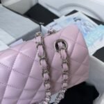 This medium classic double flap bag is crafted in lilac lambskin with silver-tone hardware, featuring the signature CC turnlock closure on the front flap, half-moon back pocket, adjustable interwoven silver-tone chain and lilac leather shoulder strap.