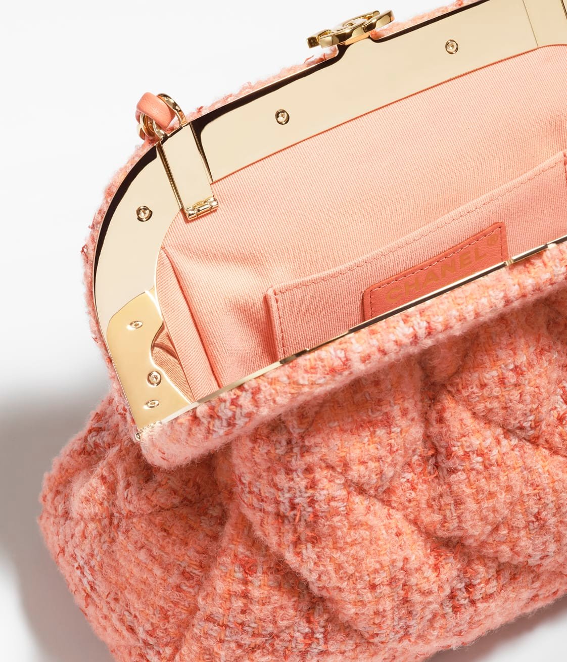 This Chanel Cloud Bag is made of orange and beige wool tweed with gold hardware, front CC logo in quilted satin, pink leather, top CC Kiss lock, interwoven gold-plated chain links and orange leather shoulder/crossbody strap
