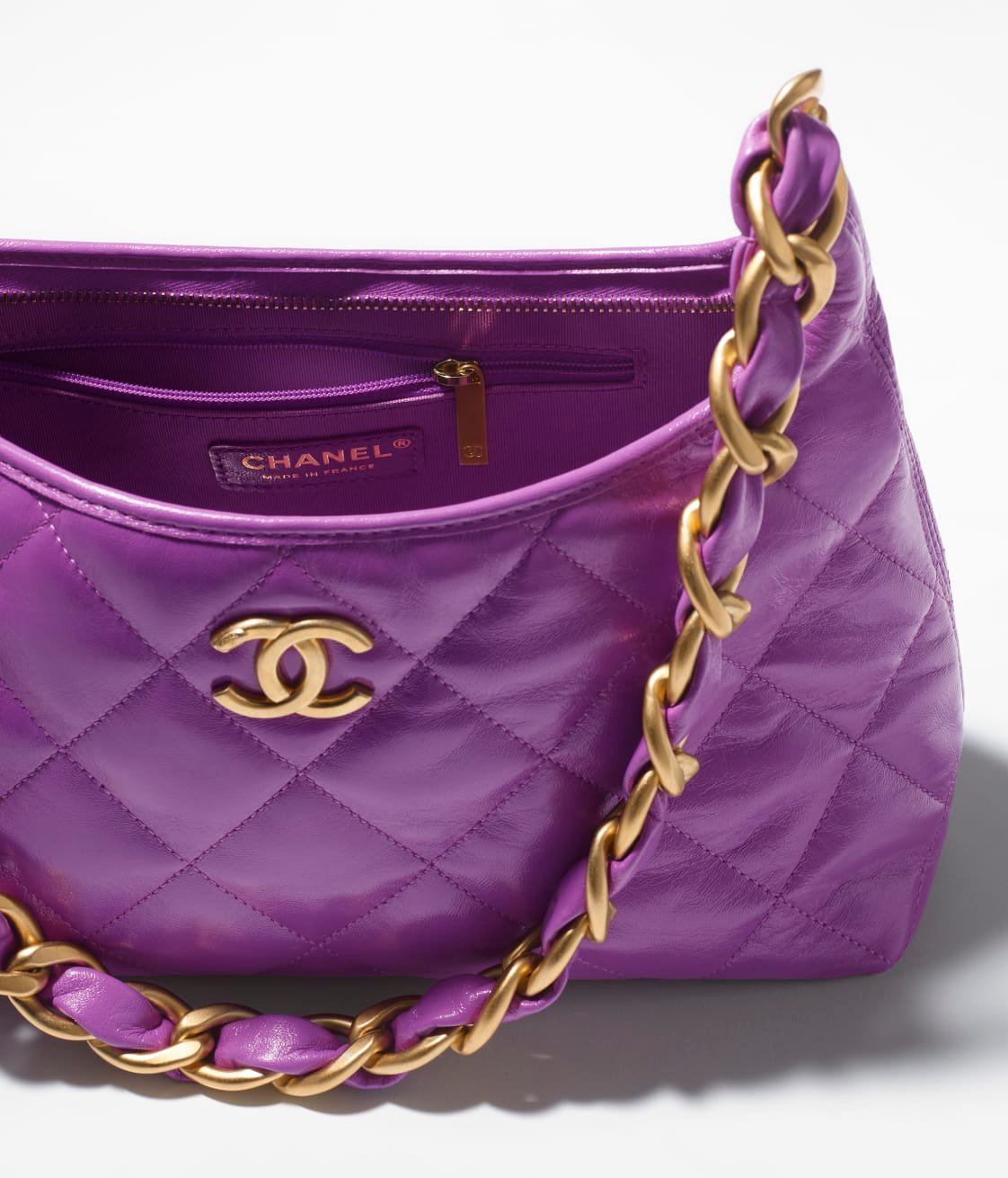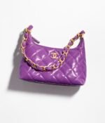 This Chanel Purple Quilted Shiny Crinkled Calfskin Hobo Bag features CC logo, shiny crinkled calfskin leather with a beautiful and luxurious feel, distressed/antique gold tone hardware. Lined with fabric. This bag is perfect for everyday use.