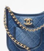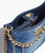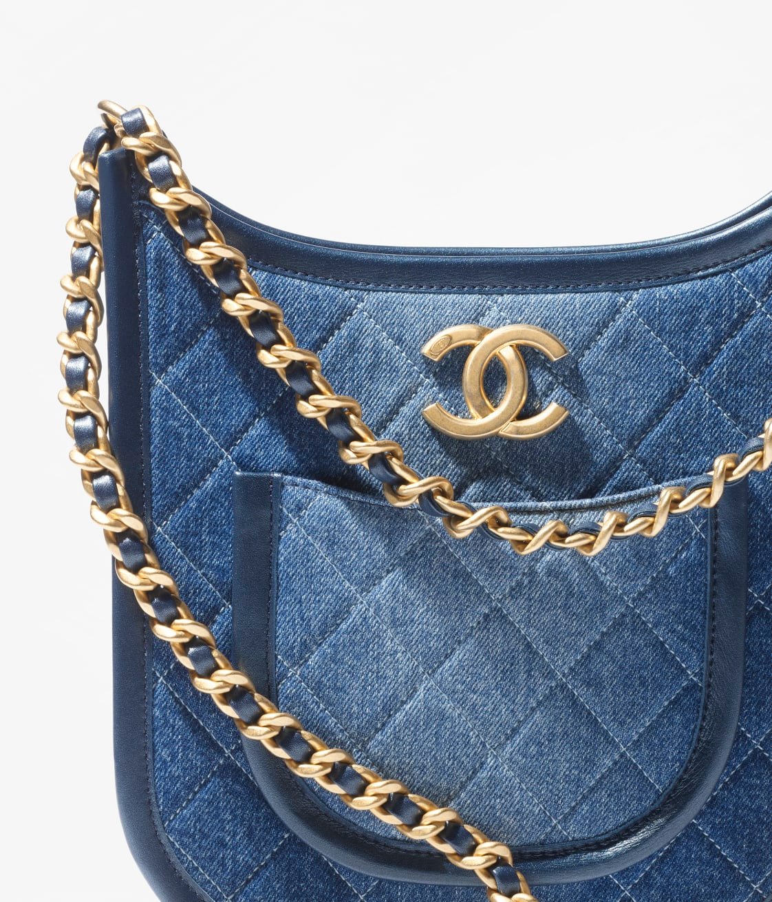 This Chanel HOBO bag is crafted in blue gradient denim with antique gold hardware, tonal stitching, front half-moon pocket with CC turnlock closure, and antique gold chain and leather shoulder/crossbody strap.