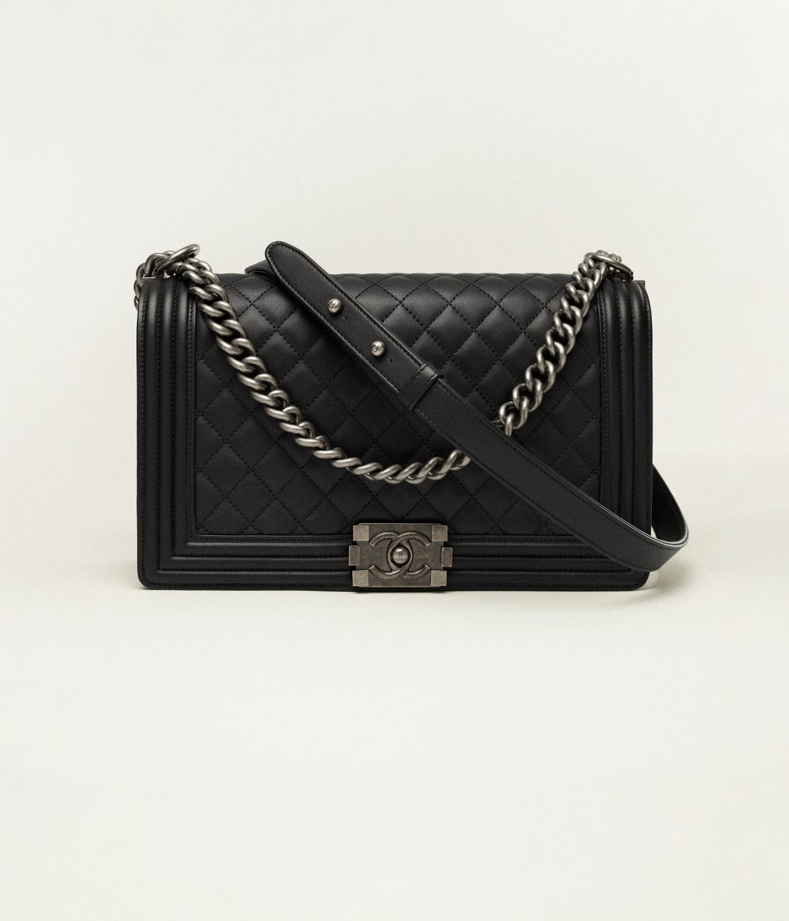This Chanel Large Boy Bag is crafted in black lambskin with ruthenium hardware and features a full front flap, Le Boy CC snaps and ruthenium-toned chain links, and a black leather padded shoulder/crossbody strap.