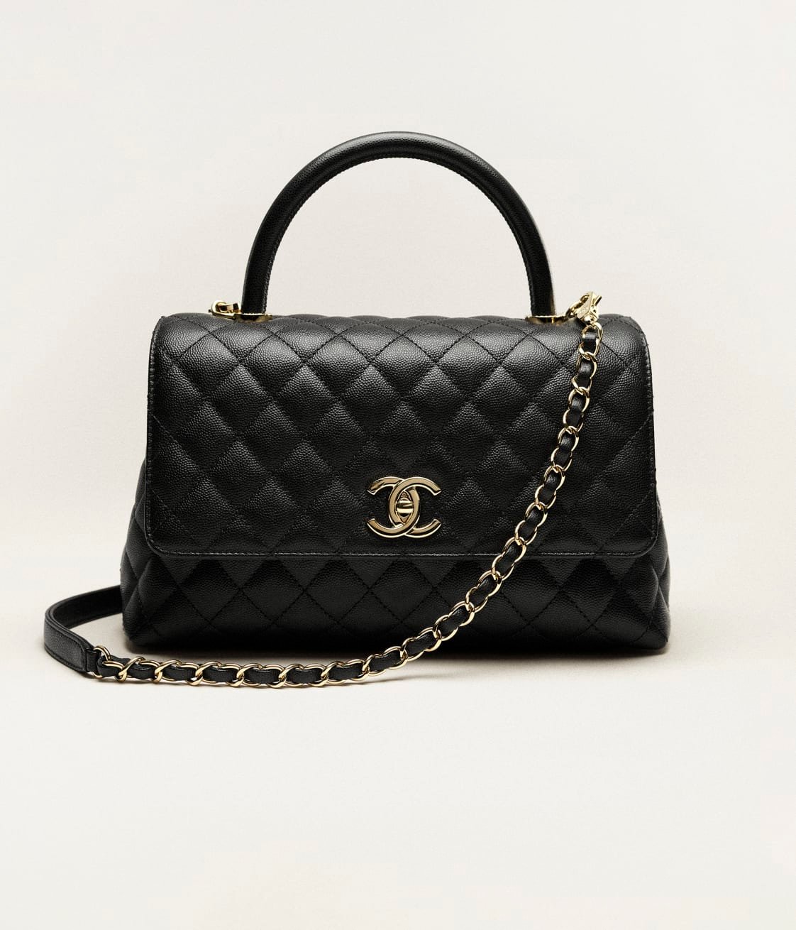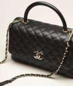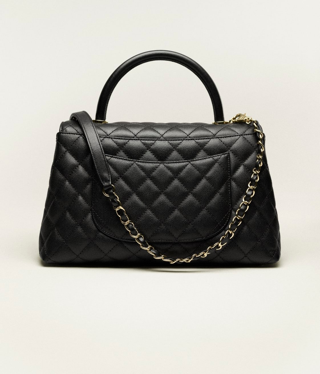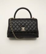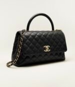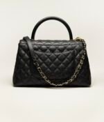 This large rectangular flap bag with top handle is made of black lambskin with gold hardware, front flap with CC turn lock closure, half moon back pocket, top handle and black leather shoulder/crossbody strap.