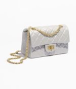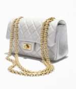 This Mini Reissue 2.55 single flap bag in light grey distressed calfskin with antique gold hardware features a front flap with a Mademoiselle turnlock closure, half-moon back pockets and interwoven gold chain links.