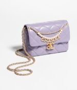 This Chanel Mini Pearl Flap Bag is crafted in metallic light purple shiny lambskin with brushed gold hardware, featuring signature diamond quilted leather, front CC turnlock closure, and convertible brushed gold and pearl leather shoulder strap.