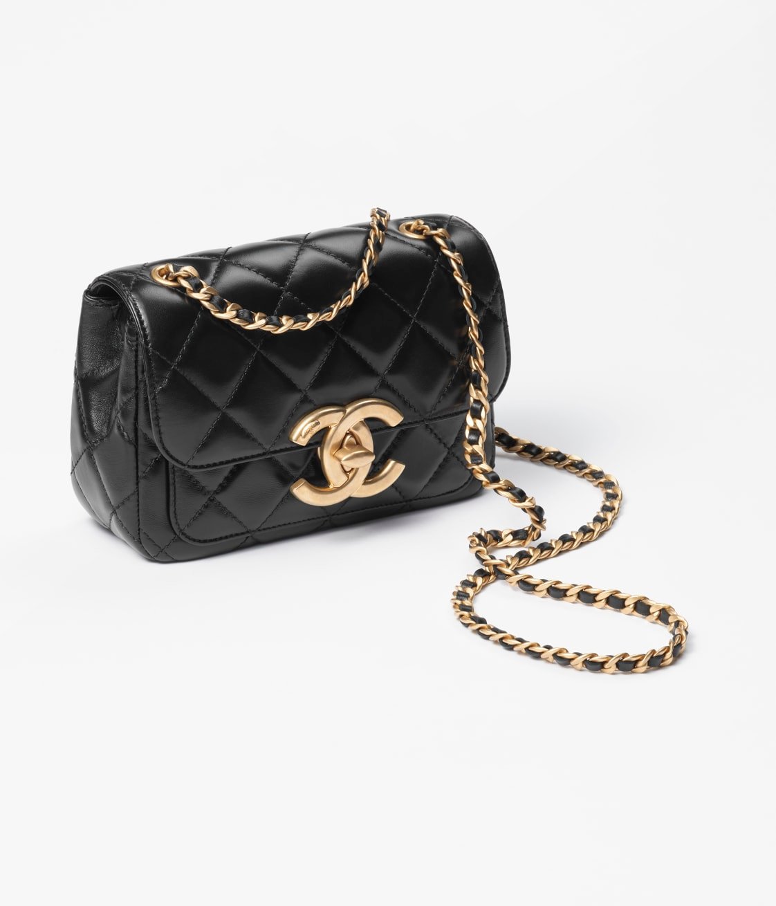 Introducing the CHANEL Mini Flap Bag in Shiny Lambskin – a chic and sophisticated take on a timeless classic. Adorned with a stunning quilted exterior and finished with the iconic CC turnlock, this exquisite bag will add a touch of luxury to any outfit. With a black quilted lambskin exterior, it also features a chain and leather interwoven sliding shoulder strap, making it an easy transition from day to night. The top flap closes with a CC turnlock and features two slip pockets for easy organization. With a front flap pocket adorned with a CC turnlock closure, this bag is both practical and stylish.