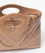 This Chanel 31 shopping bag is made of dark beige lambskin with gold-tone hardware, cut-out top handles, magnetic snap closure, CC logo on the front and shoulder strap made of dark beige leather and gold-tone chain links. The interior is lined with a light beige grosgrain and leather mix with an open pocket on the back wall.