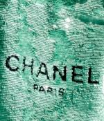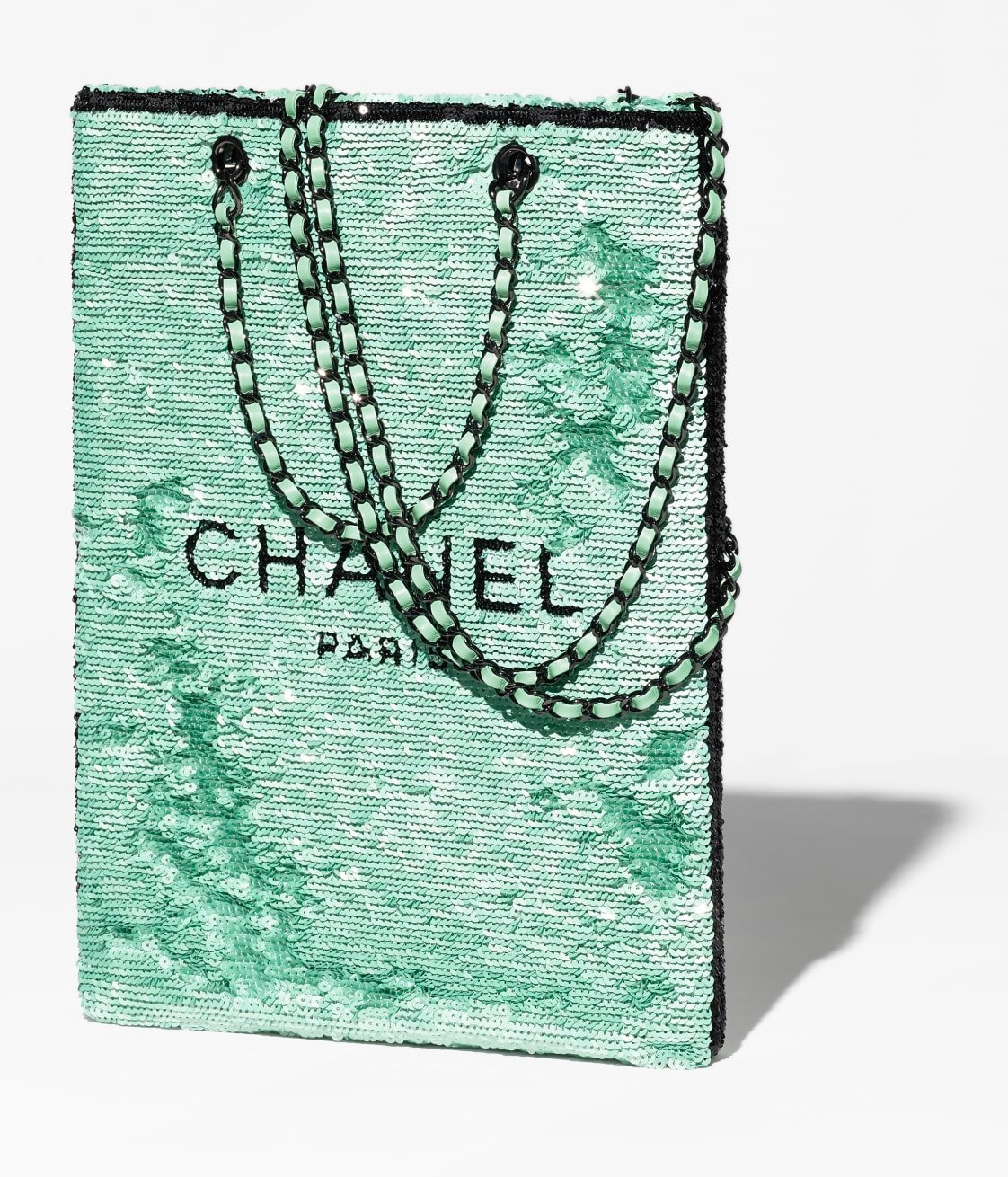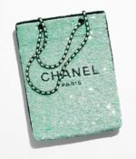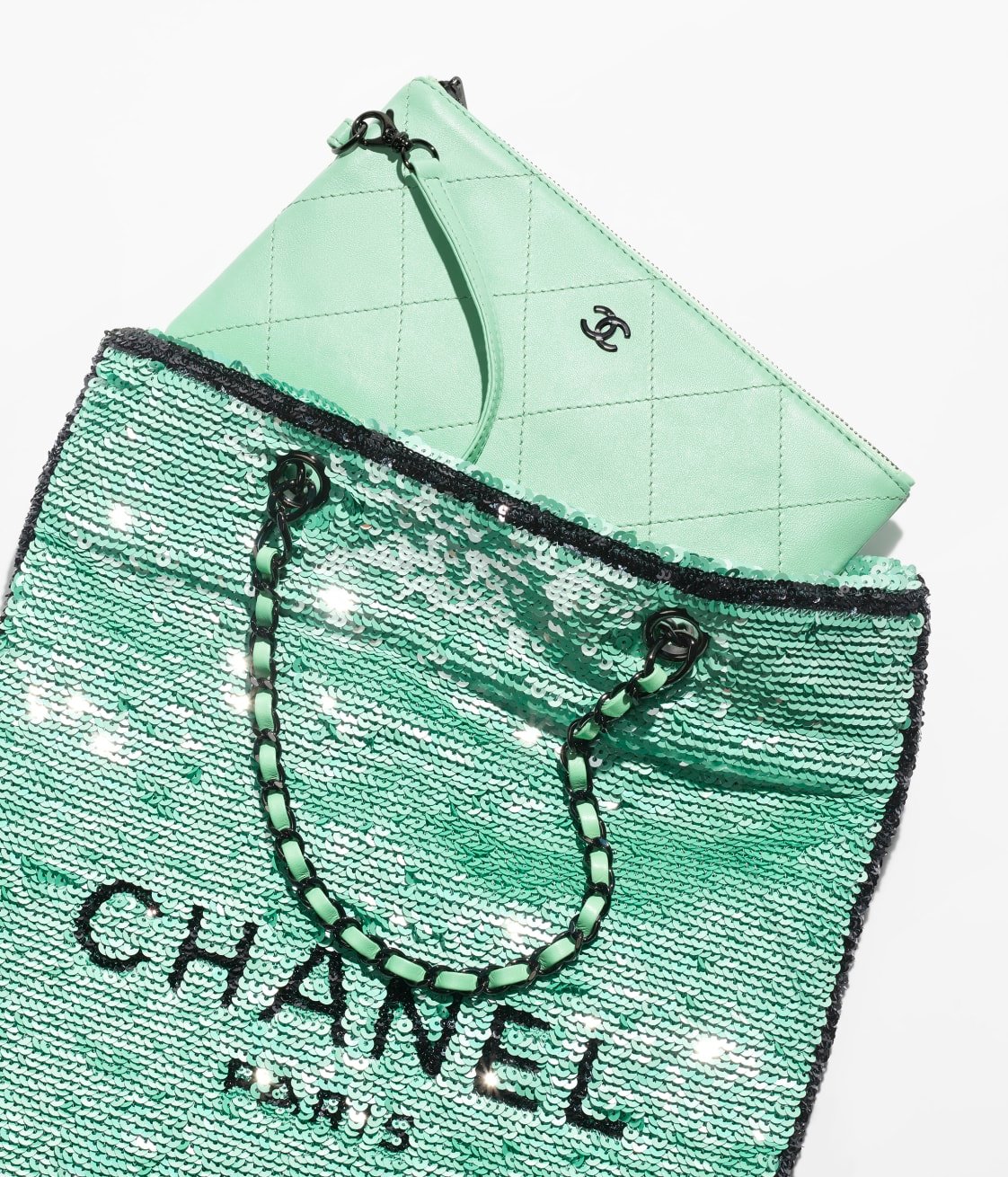 This shopping bag is made of green sequins, ribbed satin and leather with black hardware, tonal stitching, a removable interior pocket, interwoven black metal chain links and a green leather shoulder strap.