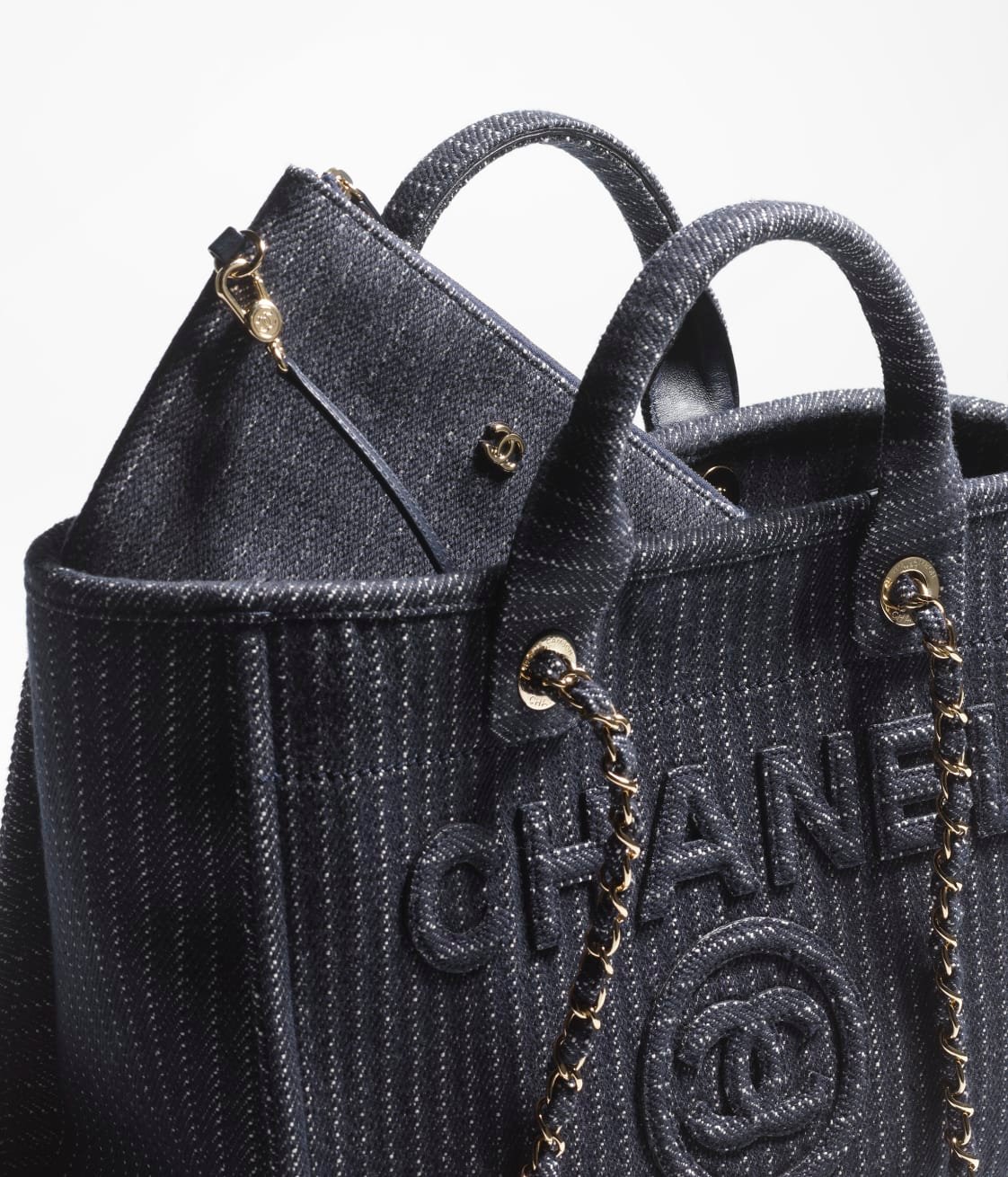 The handbag is made of distressed blue denim with light gold hardware, a large CC and Chanel logo printed on the front, a removable pouch, two rolled top handles, two interwoven light gold chain links and a blue denim shoulder strap.