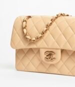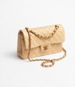 This small classic double flap bag is crafted in beige lambskin with gold hardware, front flap with signature CC turnlock closure, half-moon back pocket and adjustable gold interwoven chain link and beige leather shoulder strap.