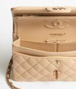The interior is lined with beige leather and features a “love letter” zip compartment under the first flap, an “outside” open pocket under the second flap, and an interior compartment with two open pockets separated by a “lipstick” compartment.