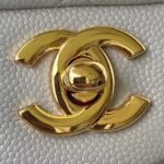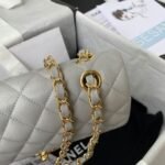 This Small Classic Double Flap bag is in grey caviar leather with light gold tone hardware and features a front flap with signature CC turnlock closure, half moon back pocket, and adjustable interwoven light gold tone chain link and grey leather shoulder strap.