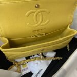 This small Classic Double Flap Bag in yellow caviar leather with light gold hardware features a front flap with signature CC turnlock closure, half-moon back pocket, adjustable interwoven light gold chain and yellow leather shoulder strap.