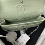 This small version of the classic double flap bag is crafted in light green caviar leather with silver hardware, front flap with signature CC turnlock closure, half-moon back pocket, adjustable interwoven silver chain and light green leather shoulder strap.
