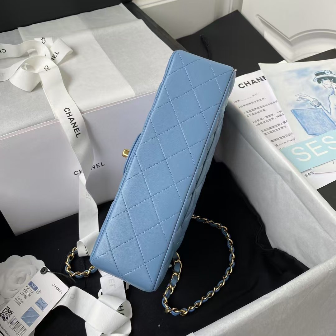 This small Classic Double Flap Bag is crafted in dark blue lambskin with gold hardware, featuring the signature CC turnlock closure on the front flap, half-moon back pockets, adjustable gold interwoven chain links and a light blue leather shoulder strap.