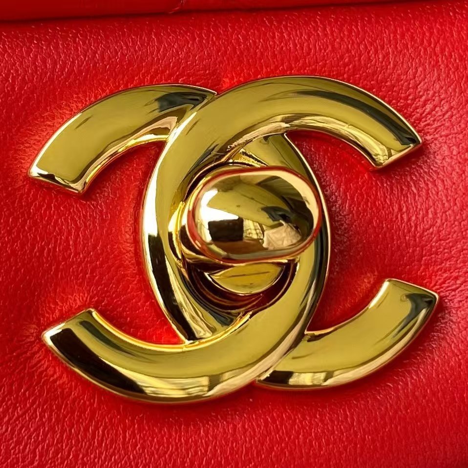 This small classic double flap bag is crafted in red lambskin with gold hardware, featuring a front flap with the signature CC turnlock closure, a half-moon back pocket, an adjustable gold interwoven chain link and a red leather shoulder strap.