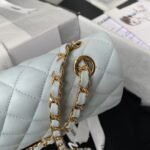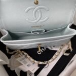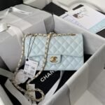 This small Classic Double Flap Bag is crafted in light blue lambskin with gold hardware, front flap with signature CC turnlock closure, half-moon back pocket, adjustable gold interwoven chain link and light blue leather shoulder strap.