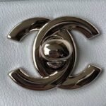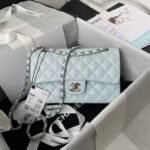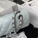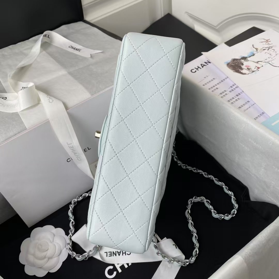 This small classic double flap bag is crafted in light blue lambskin with silver hardware, front flap with signature CC turnlock closure, half-moon back pocket, adjustable silver interwoven chain link and light blue leather shoulder strap.