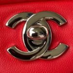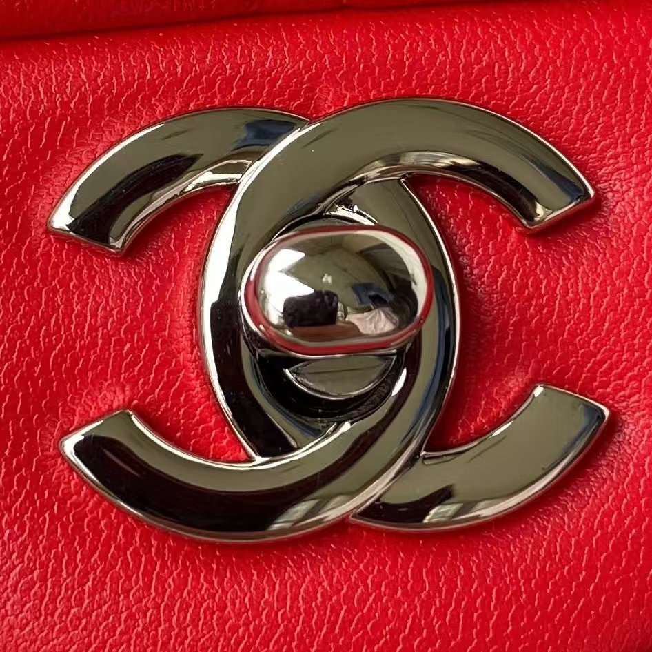 This small classic double flap bag is crafted in red lambskin with silver hardware, featuring the signature CC turnlock closure on the front flap, half-moon back pockets, adjustable silver interwoven chain links and a red leather shoulder strap.