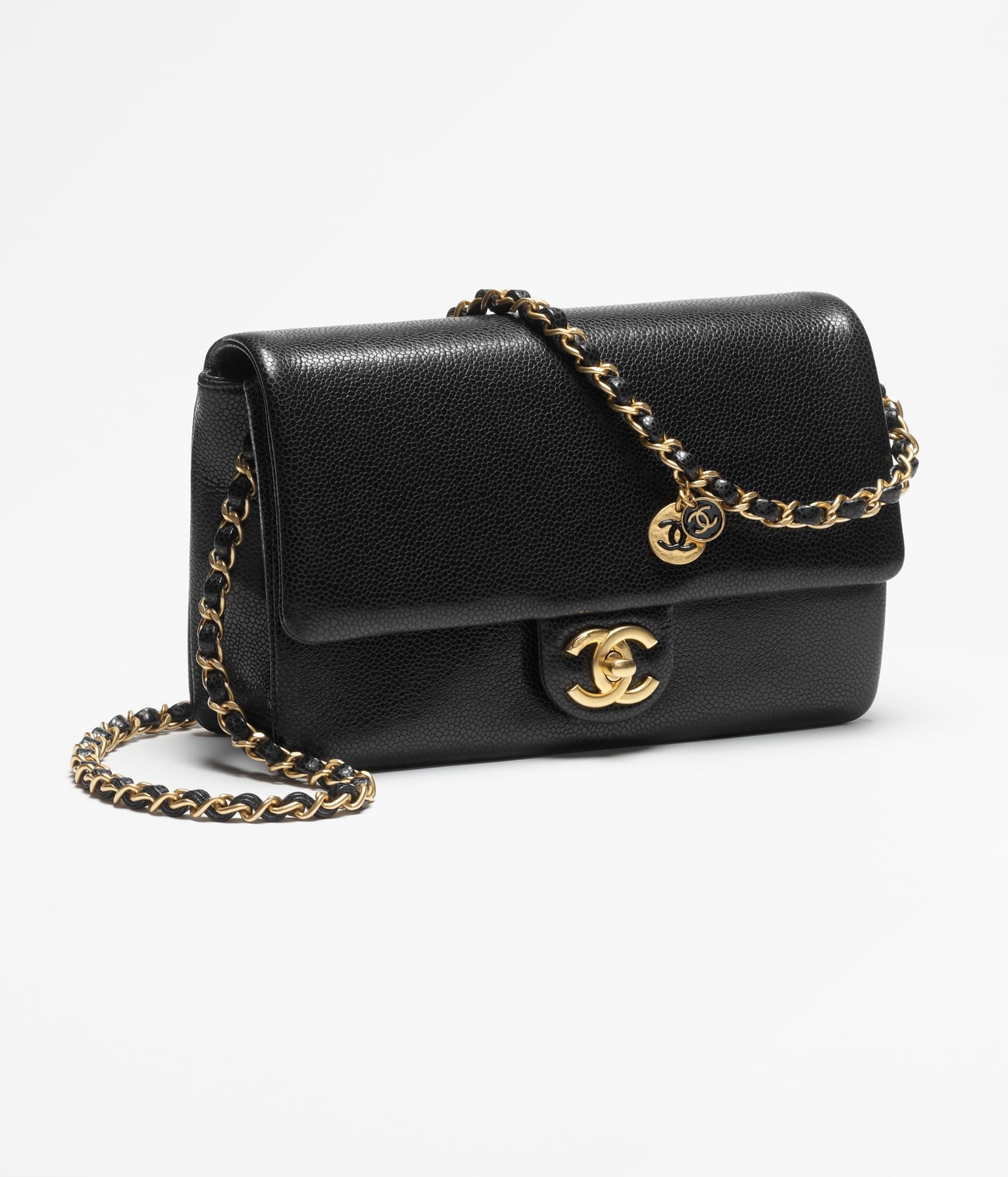 This Chanel small flap bag is of black grained shiny calfskin leather with brushed gold hardware, featuring, a front flap CC turnlock closure and a single interwoven brushed gold and black leather shoulder strap with two round CC coin charms.