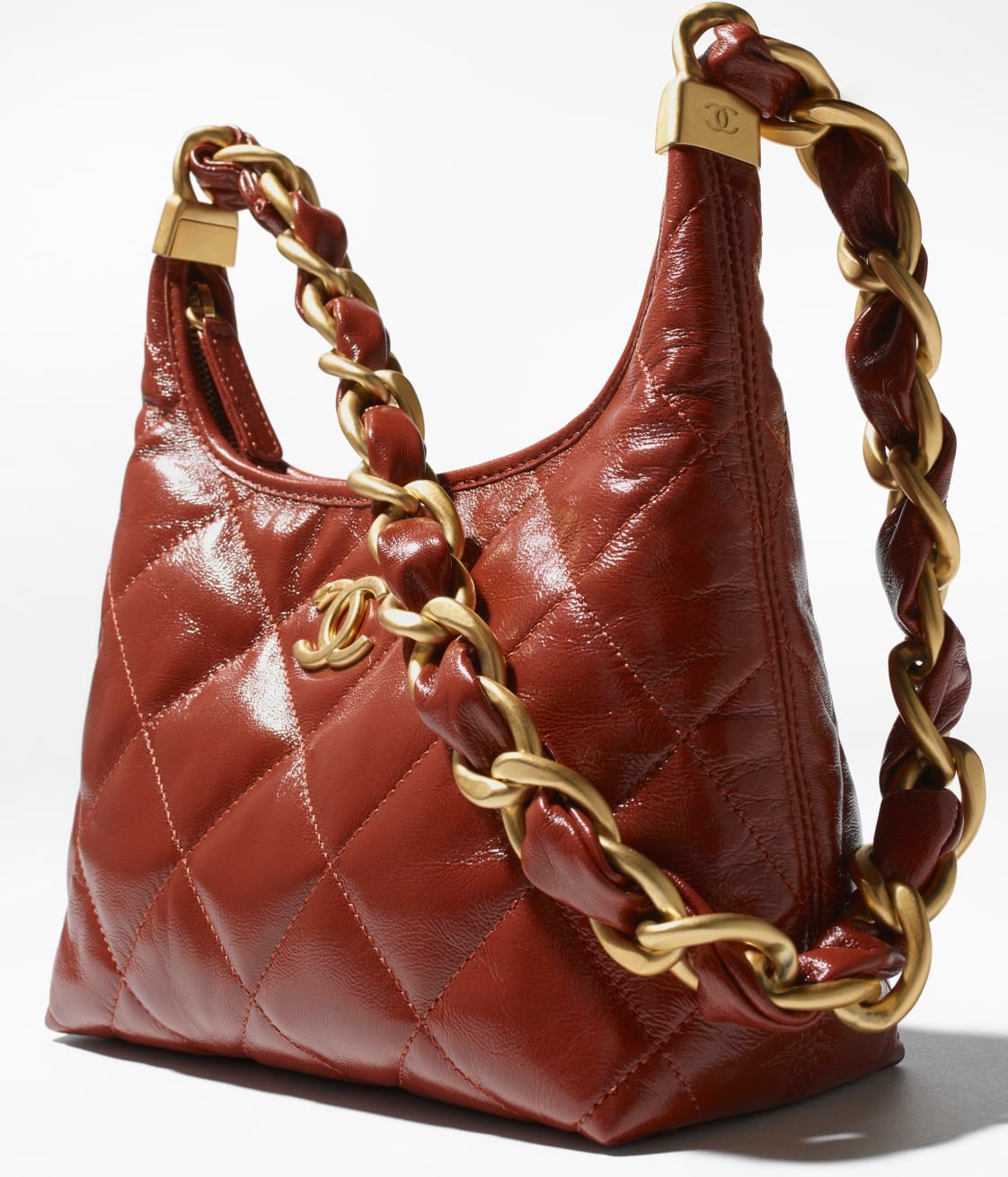 This Chanel Brown Quilted Shiny Crinkled Calfskin Small Hobo Bag features CC logo, shiny crinkled calfskin leather with a beautiful and luxurious feel, distressed/antique gold tone hardware. Lined in fabric. This bag is perfect for everyday use.