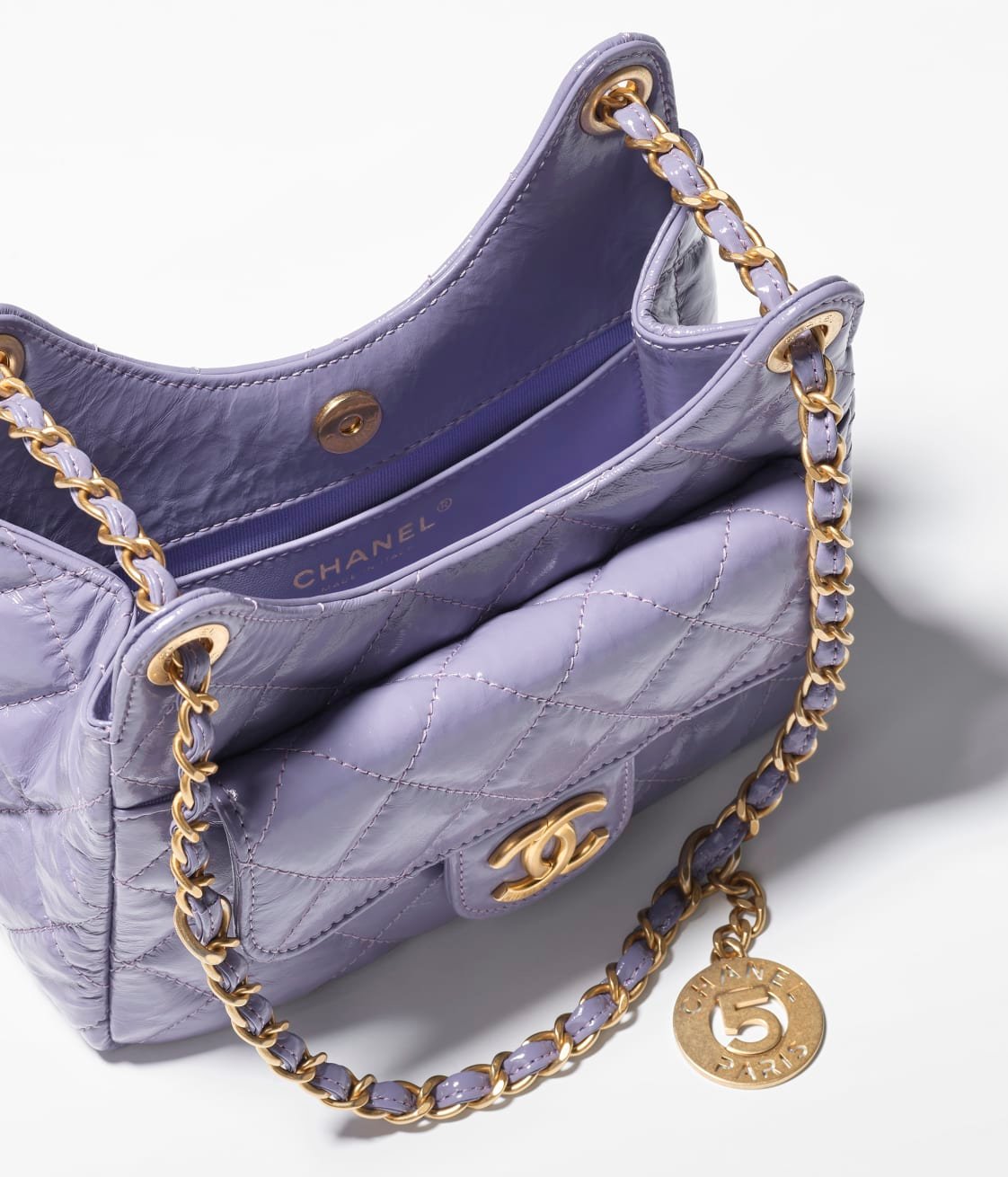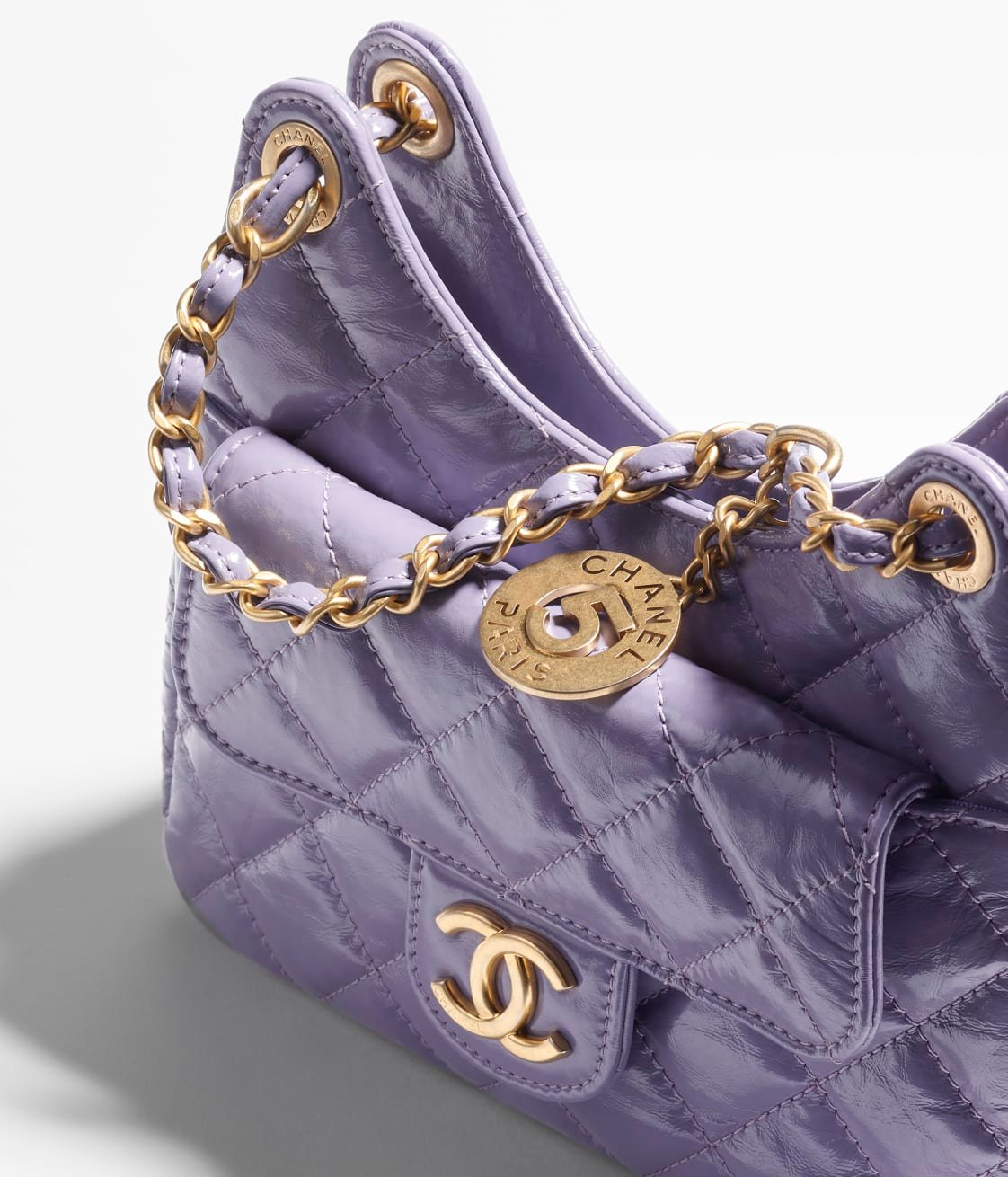 This Chanel Purple Quilted Shiny Crinkled Calfskin Small Hobo Bag features a front flap pocket with CC logo. Shiny crinkled calfskin feels exquisite and luxurious. Magnetic closure. One pocket on the back with magnetic closure. Dangling number 5 plaque. Distressed/antique gold-tone hardware. Lined in fabric. This bag is perfect for everyday use.