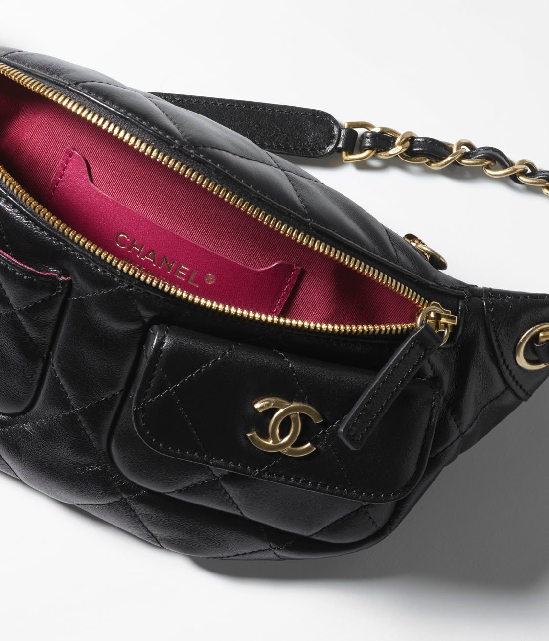 This black shiny calfskin belt bag with light gold hardware features tonal stitching and light gold hardware on the front, two small front pockets with magnetic closures, gold metal CC logo, zip pocket on the belt bag, light gold and metal interweaving, black leather chain link belt/crossbody strap.