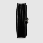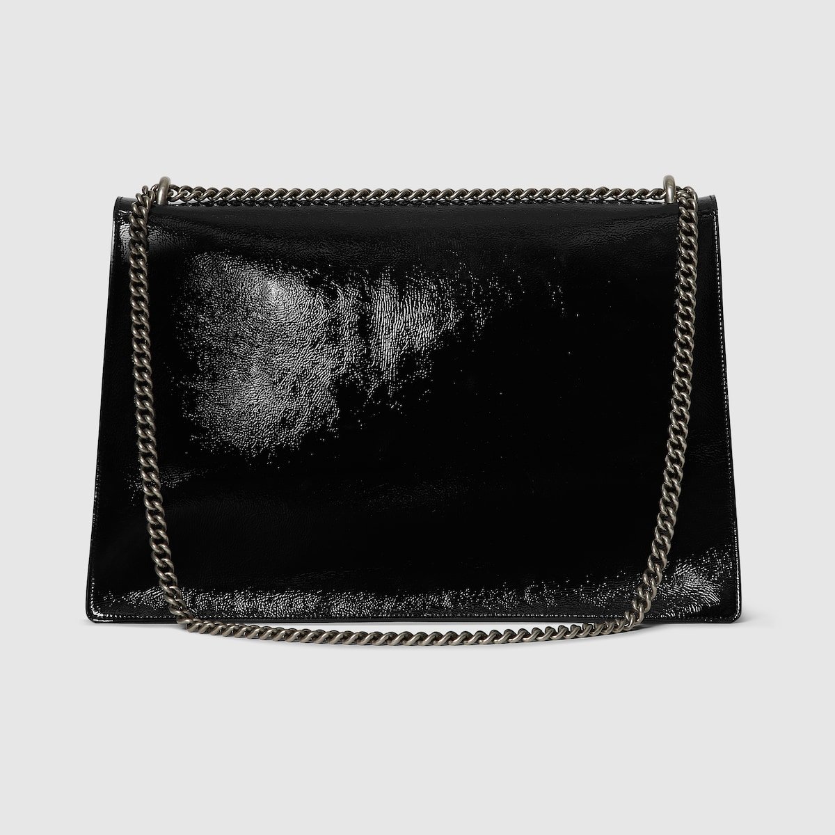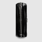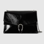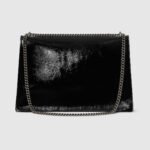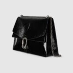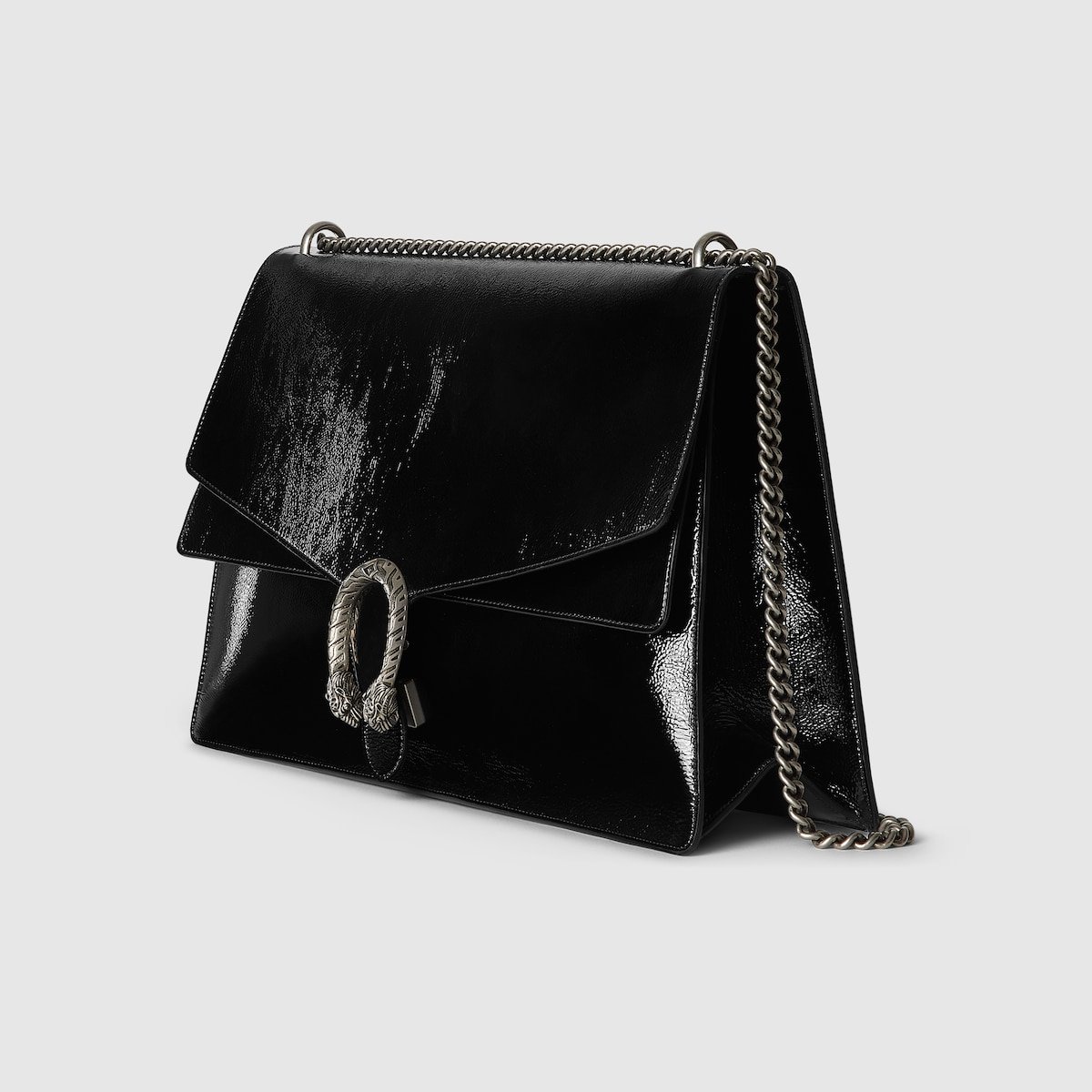 Gucci presents a maxi version of the signature Dionysus shoulder bag. Designed with a more contemporary look, this iteration in sleek black patent leather features a tiger head closure with a flap and a sliding chain that can be adjusted to wear with the preferred length and style.