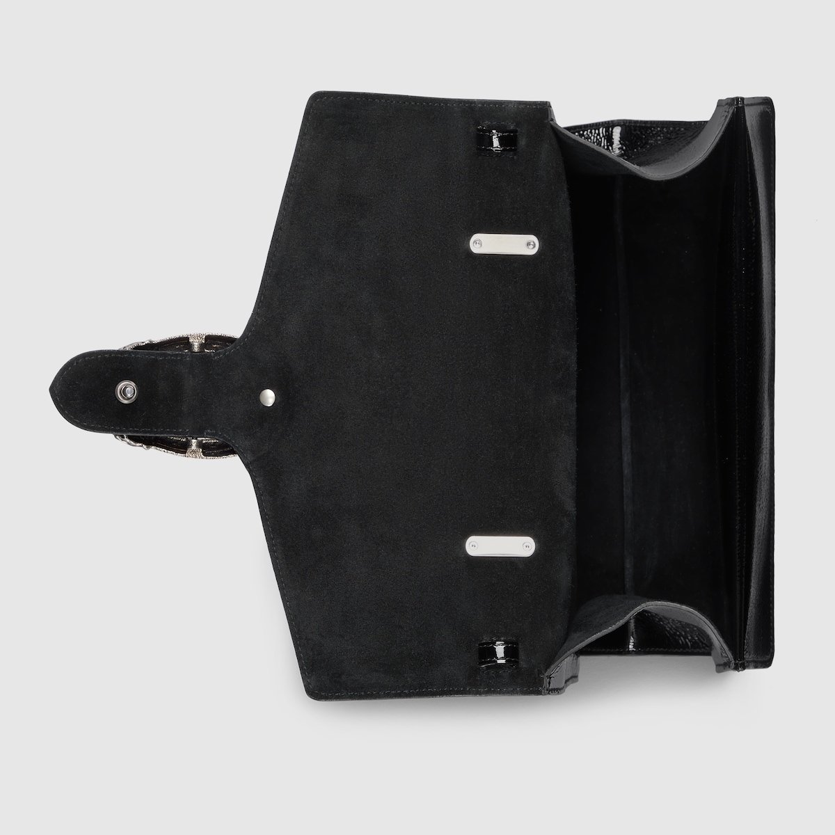 Gucci has unveiled a new style for the iconic Dionysus line. The top handle bag features a contemporary look, and is crafted in sleek black patent leather. At the front appears the signature tiger head closure with a flap, as well as a sliding chain that can be adjusted to suit the wearer’s preferred length and style.