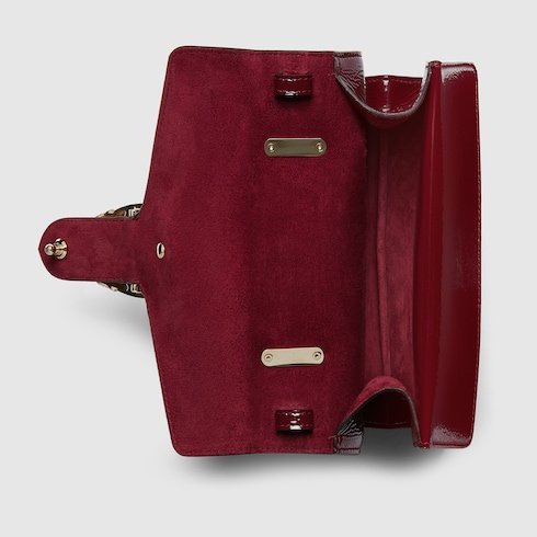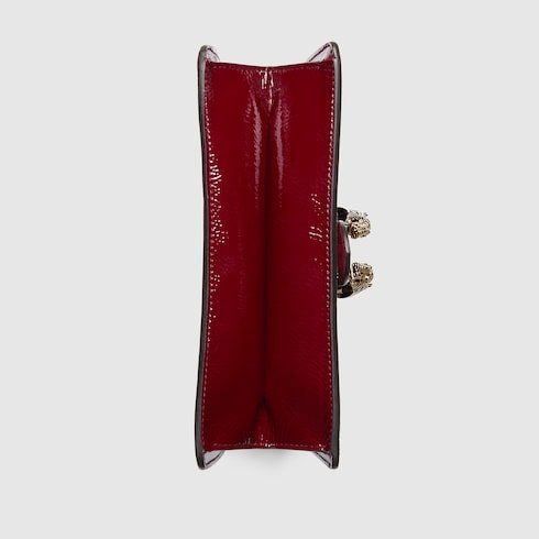 Gucci’s Creative Director Sabato de Sarno presents a small version of the signature Dionysus shoulder bag. Designed with a more contemporary look, this iteration in sleek Rosso Ancora patent leather features a tiger head closure with a flap and a sliding chain that can be adjusted to wear with the preferred length and style.