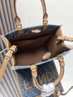 采用浅蓝色牛仔布制成,带有 FF 图案、米色皮革“Fendi Roma”字样和米色皮革管状手柄。