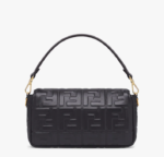 Iconic medium Baguette bag made of black soft nappa leather with a three-dimensional texture FF motif. Decorated with an FF clasp.