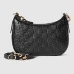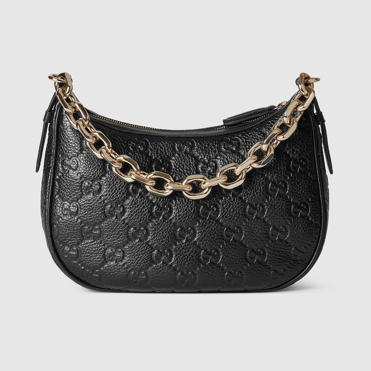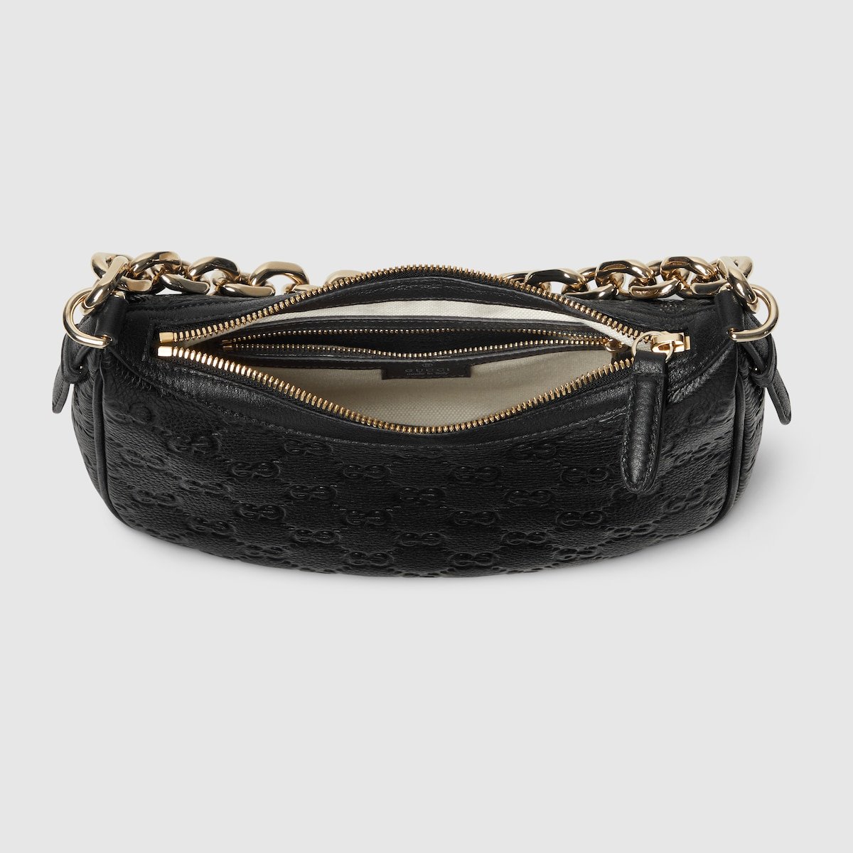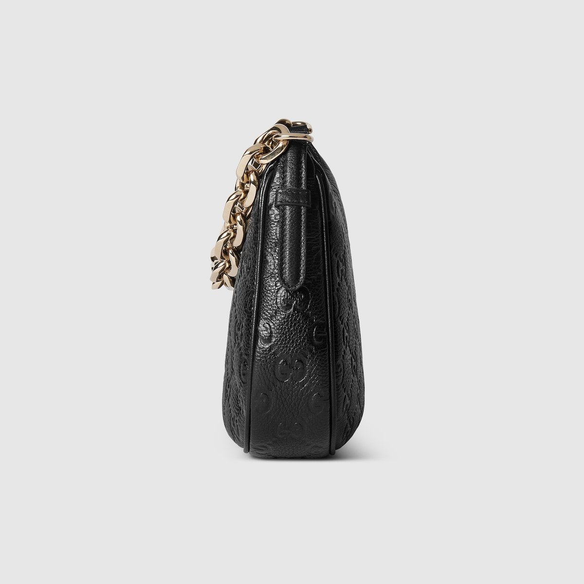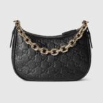 The new GG Emblem collection reinterprets the House’s history of elegance and craftsmanship. This small half moon shoulder bag features a light gold-toned chain, and comes with an additional leather shoulder strap for crossbody wear.