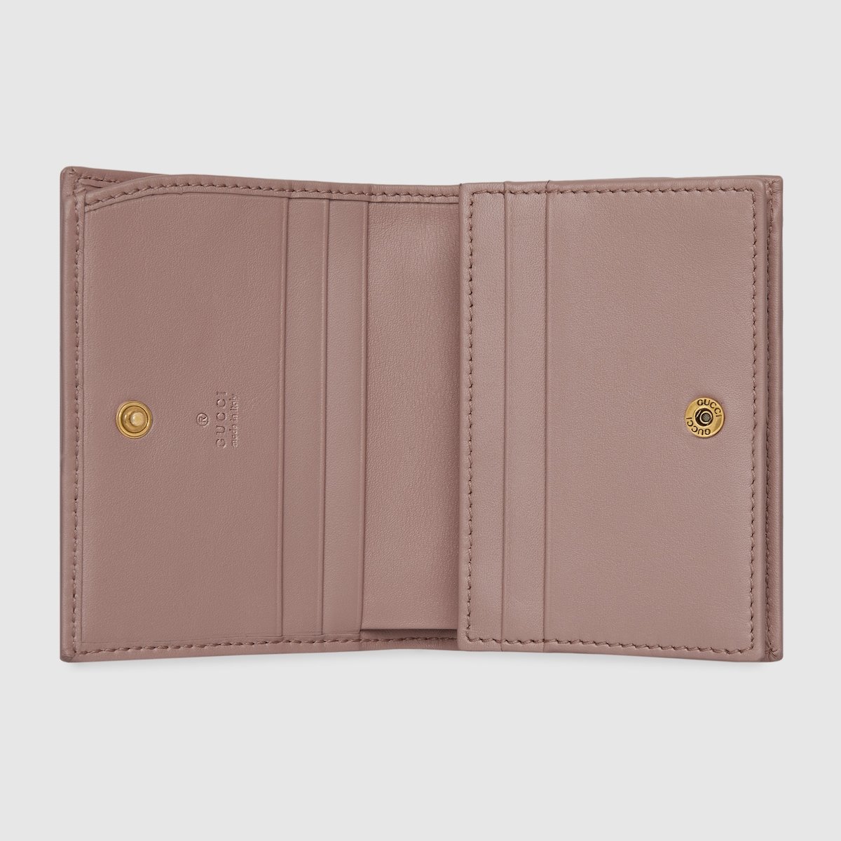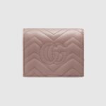 The GG Marmont collection is defined by the emblematic Double G hardware—a contemporary take on a Gucci archival belt buckle from the ’70s that has become a hallmark of the House. The card case wallet is crafted in soft matelassé leather that coordinates with bags of the collection.