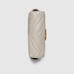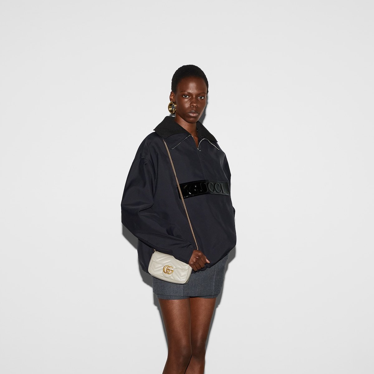 Crafted from ligt grey matelassé chevron leather, this super mini bag is defined by the emblematic Double G logo in antique gold-toned hardware. A key ring that can be used to attach the accessory to a separate bag completes the style.