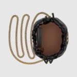 The world of GG Marmont expands with the introduction of a mini bucket bag shape in black matelassé leather with a chevron motif. Inspired by an archival design from the ’70s—a hallmark era of the House—the Double G decorates the front of this accessory. Featuring a chain strap and drawstring closure the versatile shape can also be worn as a cross body bag.