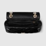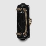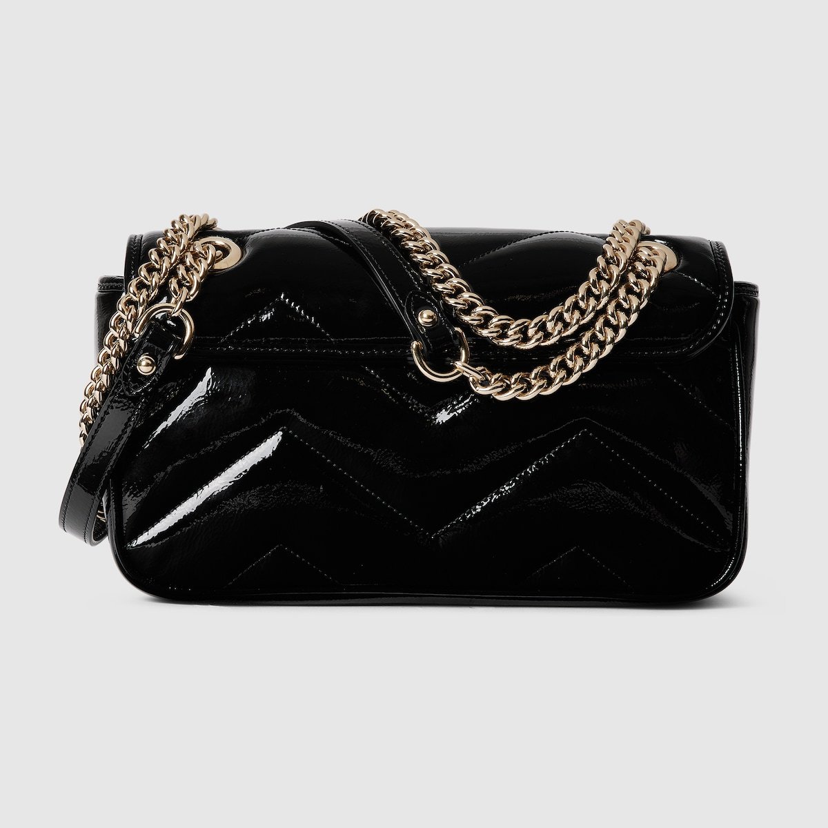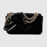 The GG Marmont collection spotlights sophisticated leather in dark tones to welcome Pre-Fall. Crafted in quilted chevron patent leather, this small shoulder bag underlines its contemporary silhouette in black, complete with light gold toned hardware.