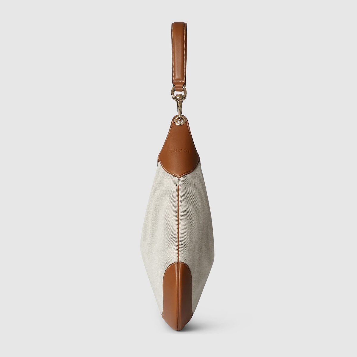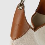Introducing the Gucci B, which draws inspiration from a 1950s archival style. This medium shoulder bag, embodying the essence of its mid-20th century design origins, is crafted from natural canvas which drapes on the body.