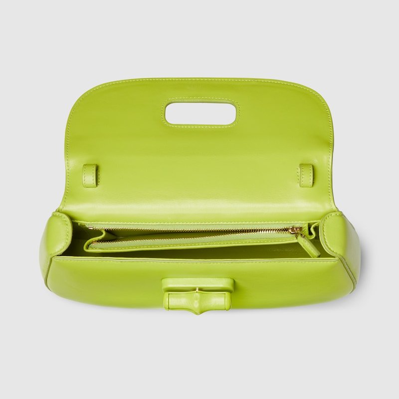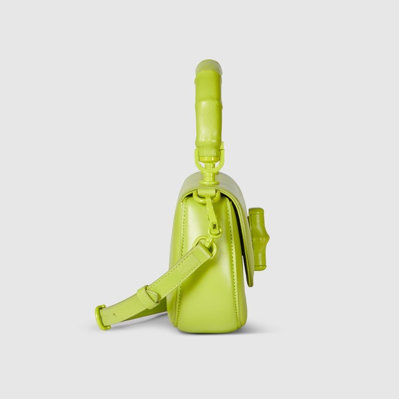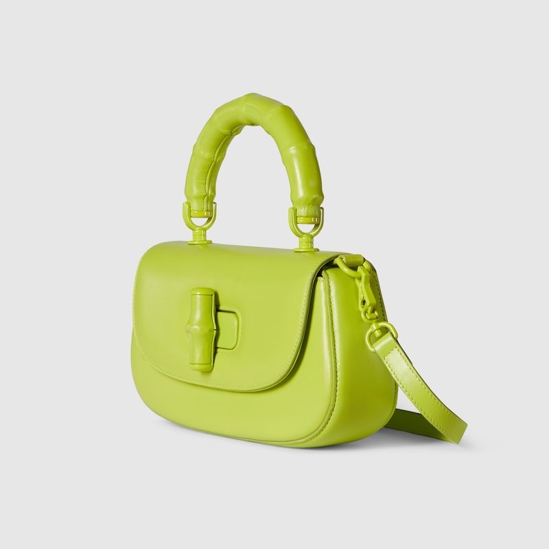 In the Spring Summer 2025 collection, this small top handle bag in soft leather reinterprets the signature bamboo motif with monochromatic hardware. Gucci Bamboo Diva is the starring feature for any look.