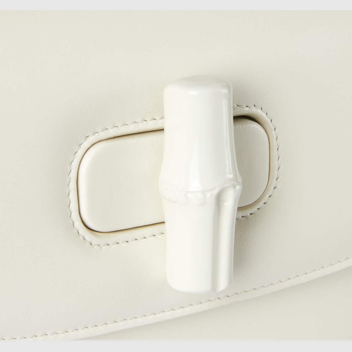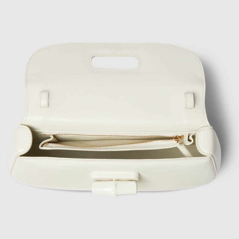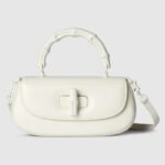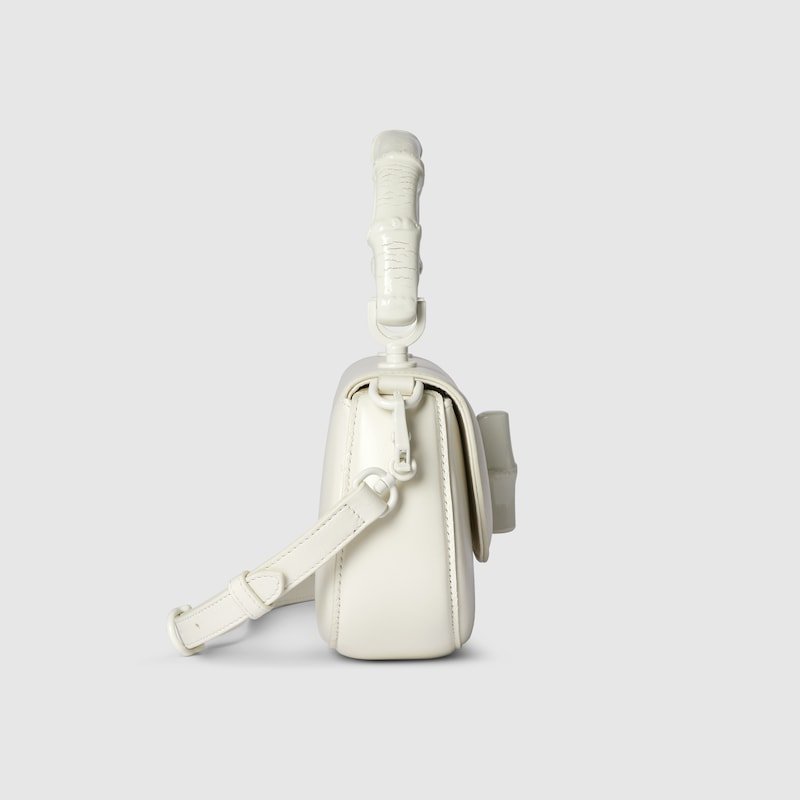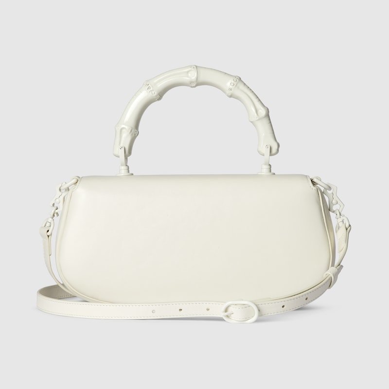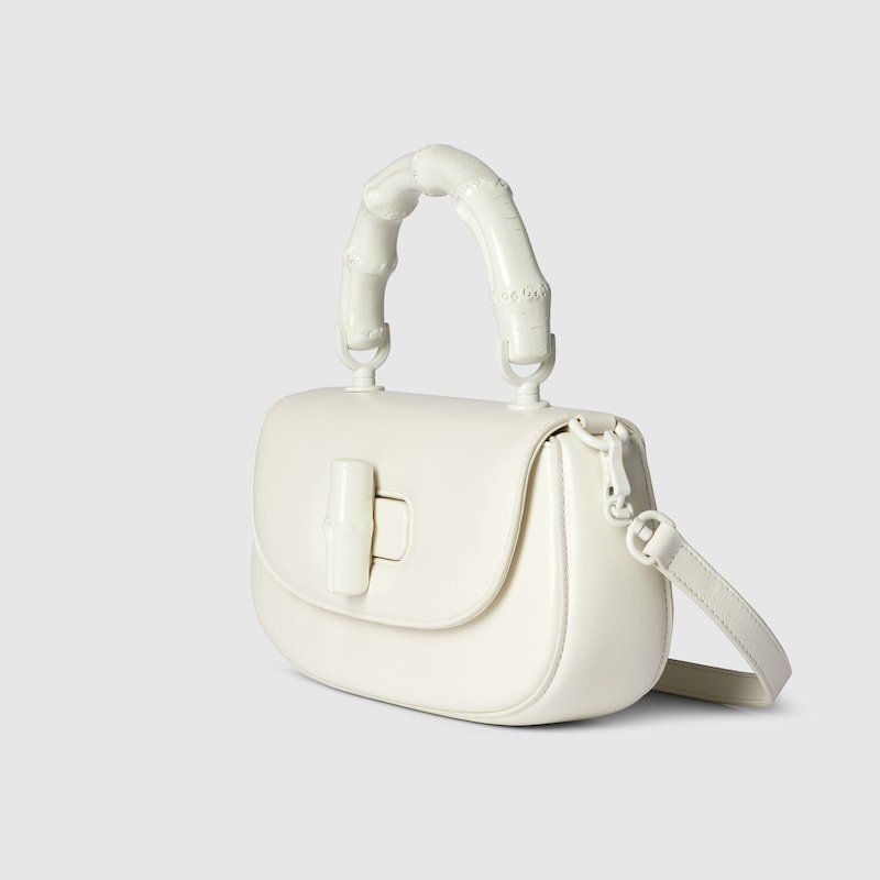 In the Spring Summer 2025 collection, this small top handle bag in soft leather reinterprets the signature bamboo motif with monochromatic hardware. Gucci Bamboo Diva is the starring feature for any look.