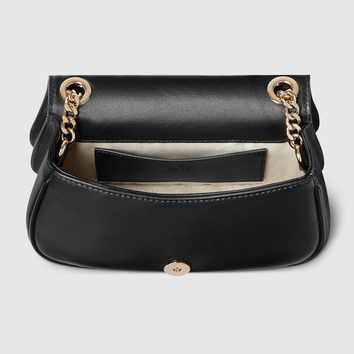 The new Gucci Blondie bag, whose distinctive logo first appeared in the House’s collections in the early 1970s, weaves together past and present in a fusion of nostalgia and modernity. This mini shoulder bag with a gold-toned chain is crafted from black leather, featuring the House’s round symbol in enamel.