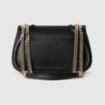 The new Gucci Blondie bag, whose distinctive logo first appeared in the House’s collections in the early 1970s, weaves together past and present in a fusion of nostalgia and modernity. This small shoulder bag is crafted from black leather, featuring the House’s round symbol in enamel. The gold-toned chain and leather strap can be worn on the shoulder or crossbody.