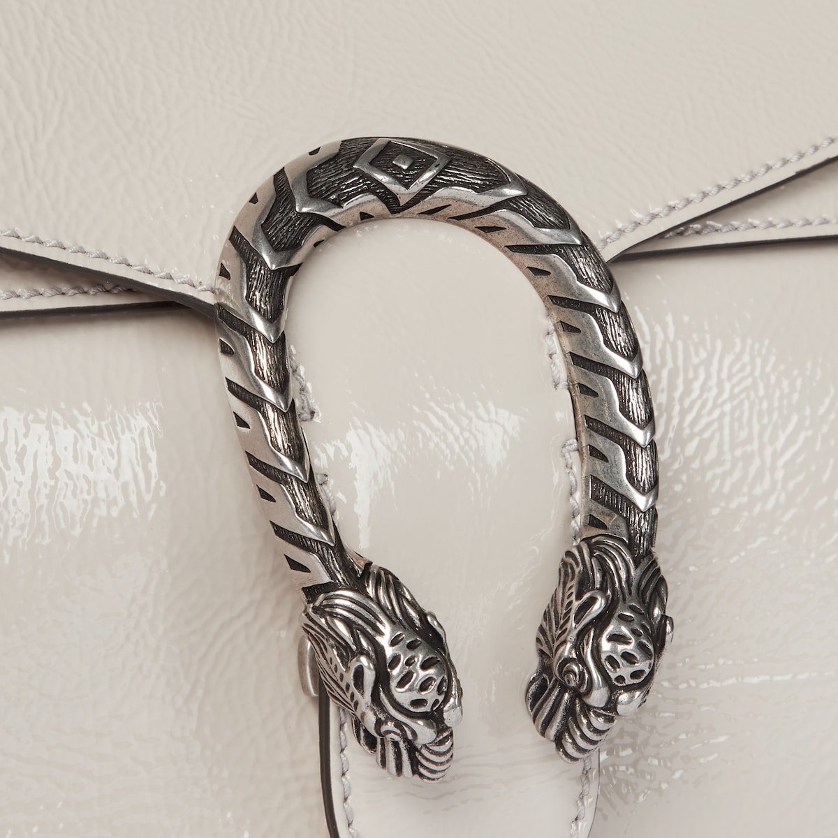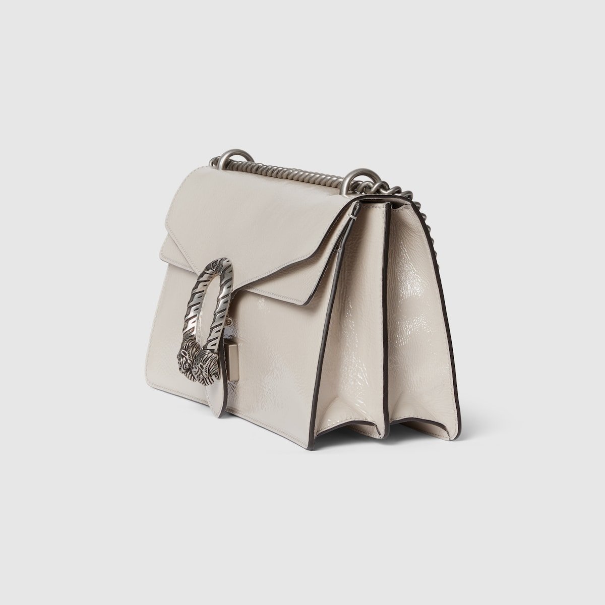 A soft, deconstructed version of the signature Dionysus shoulder bag presents a contemporary look. This style in sleek light grey patent leather features the iconic tiger head closure with a flap and a sliding chain that can be worn both as a shoulder bag and a top handle bag, giving it many possibilities to wear.
