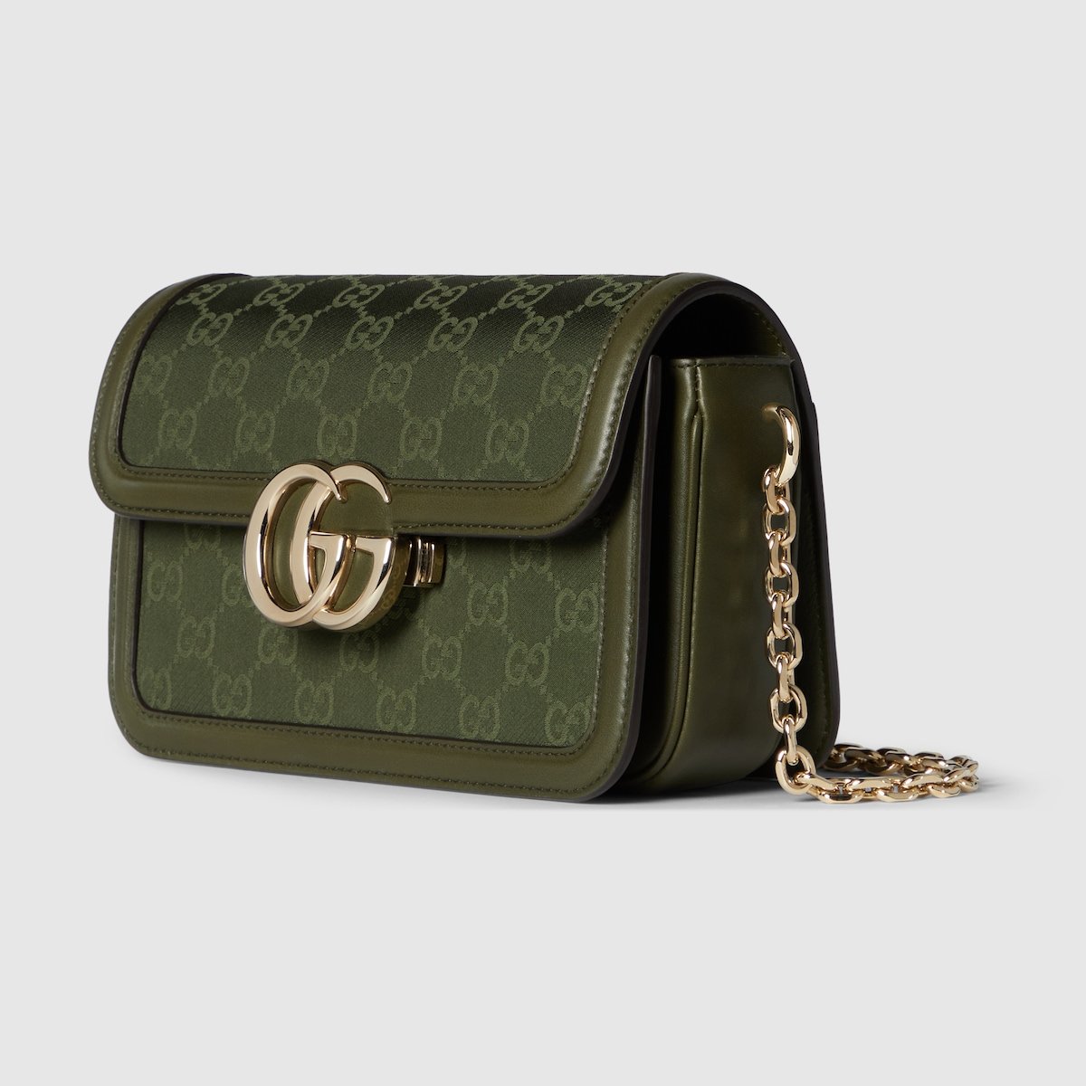 The Gucci Go is made for movement. In the Spring Summer 2025 collection, this shoulder bag is characterized by sophisticated yet lightweight GG canvas and a refined chain strap. It also features functional internal organization, and a detachable mirror on the back.