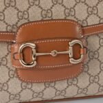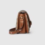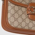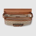 The Gucci Horsebit 1955 continues its equestrian-inspired design with the double ring and bar hardware, blending light gold-toned details and GG Monogram coated fabric, with a soft and sophisticated feel, on this shoulder bag.