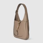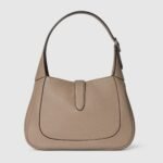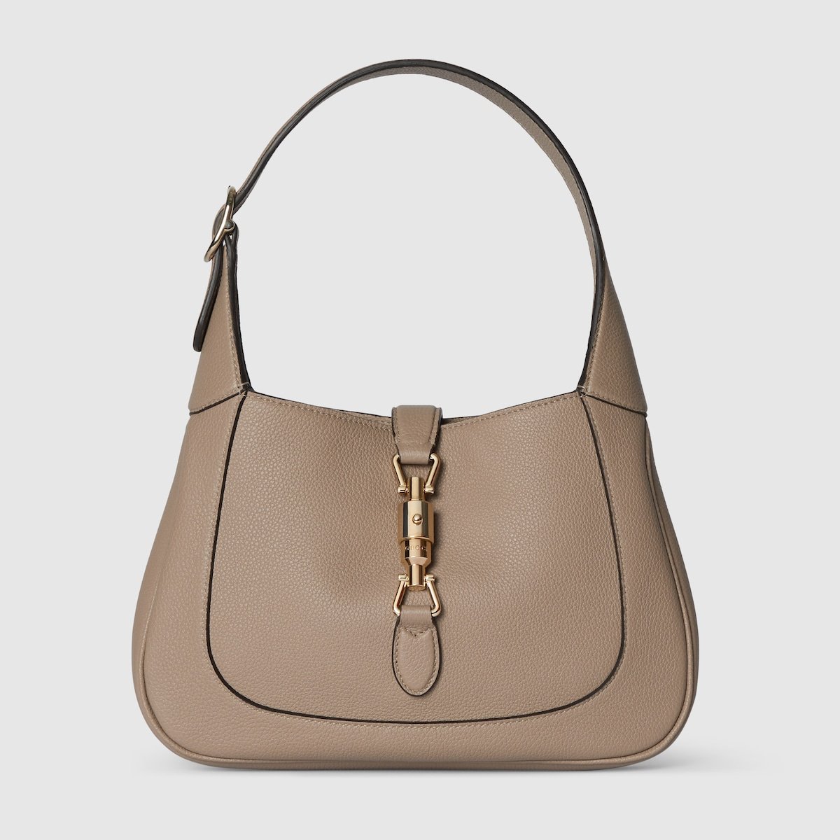 In the Fall Winter 2024 collection, the Gucci Jackie 1961 shoulder bag with new light gold-toned piston closure features fine taupe leather, highlighting the craftsmanship, crescent shape, and sleek silhouette of the House’s iconic handbag. This small size comes with a leather strap and additional green and red Web strap for different styling possibilities.